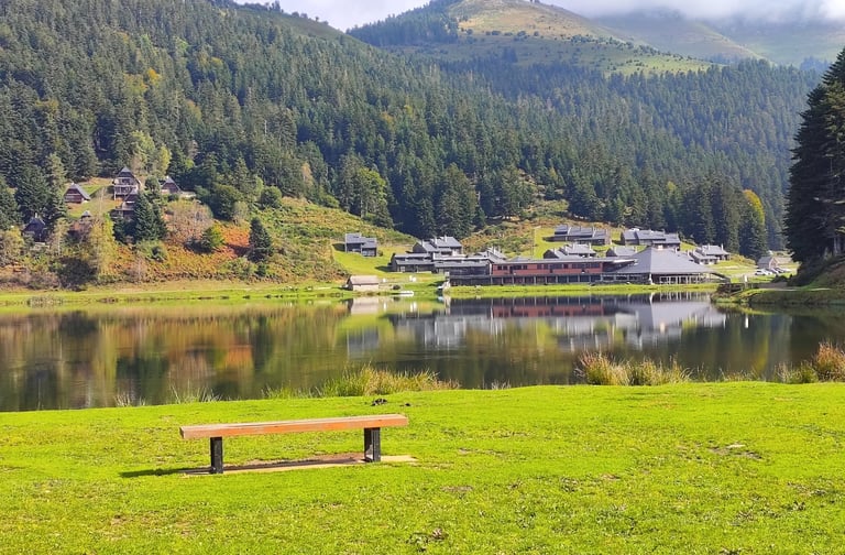 Au bord du lac Payolle, entouré de montagnes enneigées, un refuge chaleureux pour vos plus beaux moments.